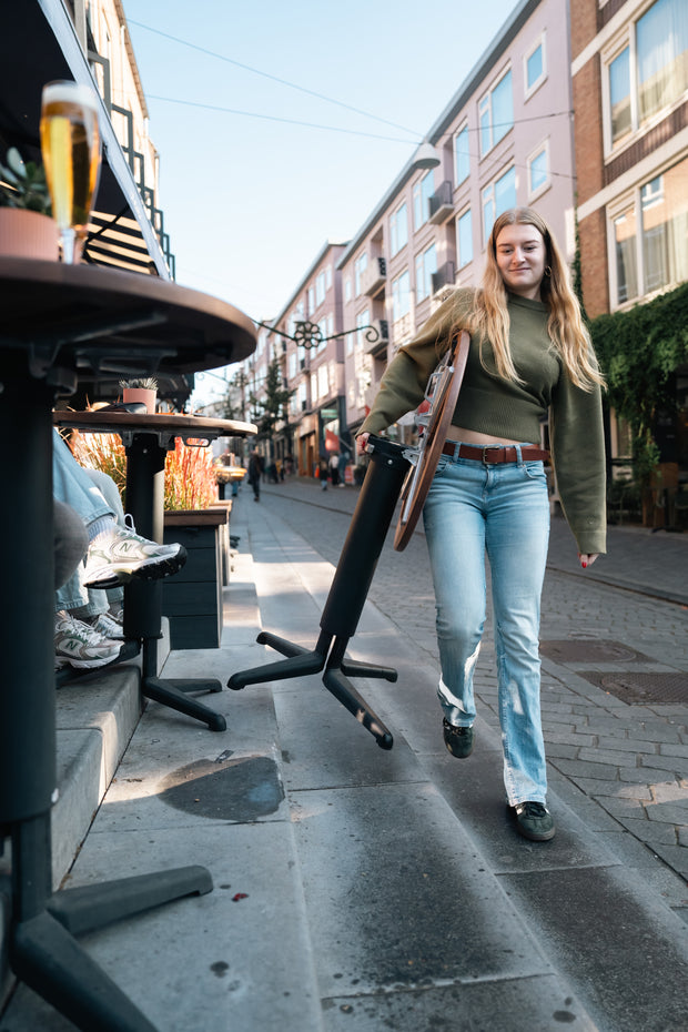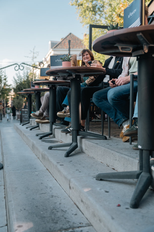 Of je nu een café runt, een druk terras beheert of een evenement organiseert — FlexTable maakt het verschil. Dankzij het verstelbare onderstel en de automatische stabilisatie transformeert elke tafel zich moeiteloos van zittend diner naar staande receptie. Zelfs op ongelijke vloeren blijft alles stevig staan. Zo geef je jouw gasten comfort én creëer je zelf meer vrijheid in hoe je je ruimte gebruikt.